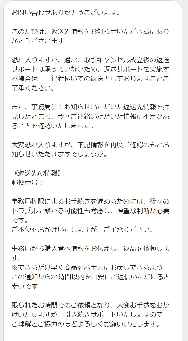 戻ってきた商品も着払いでこちらが負担しないといけないそうで、