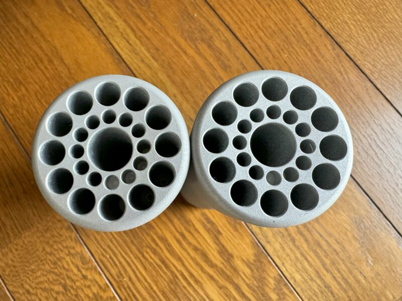 上部に開けられた穴は全部で25個。穴の大きさはさ3種類で、深さはすべて違います。この深さ、大きさのちがうそれぞれの穴で、幅広い周波数帯に効果を持たせています。