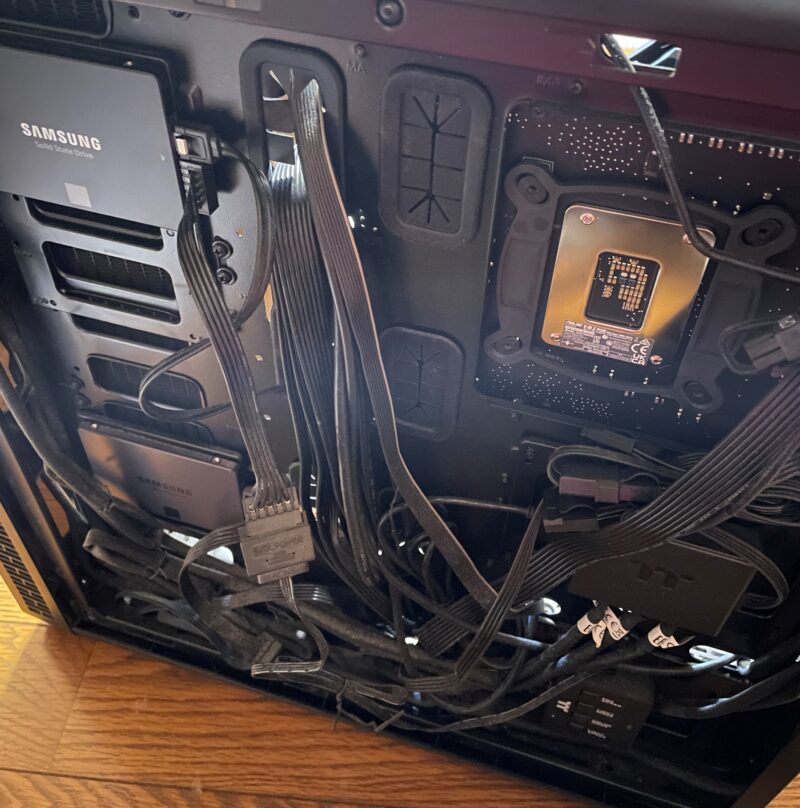 新しいマザーボードにCPU・DDR5メモリ・M.2SSDをとりつけケースに固定し、クーラーにグリスを塗って